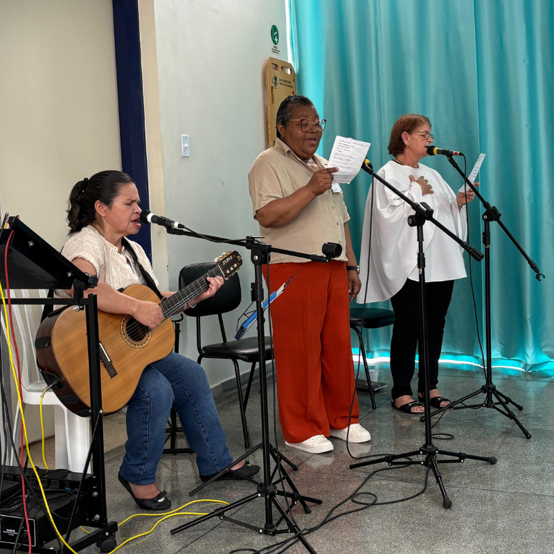 A banda que entoou os cânticos da missa é formada por três voluntárias, que estão na Pastoral de Itaquá há mais de duas décadas. Bernadete Rodrigues iniciou sete meses após a inauguração do hospital, hoje, aos 57 anos, é a violonista.